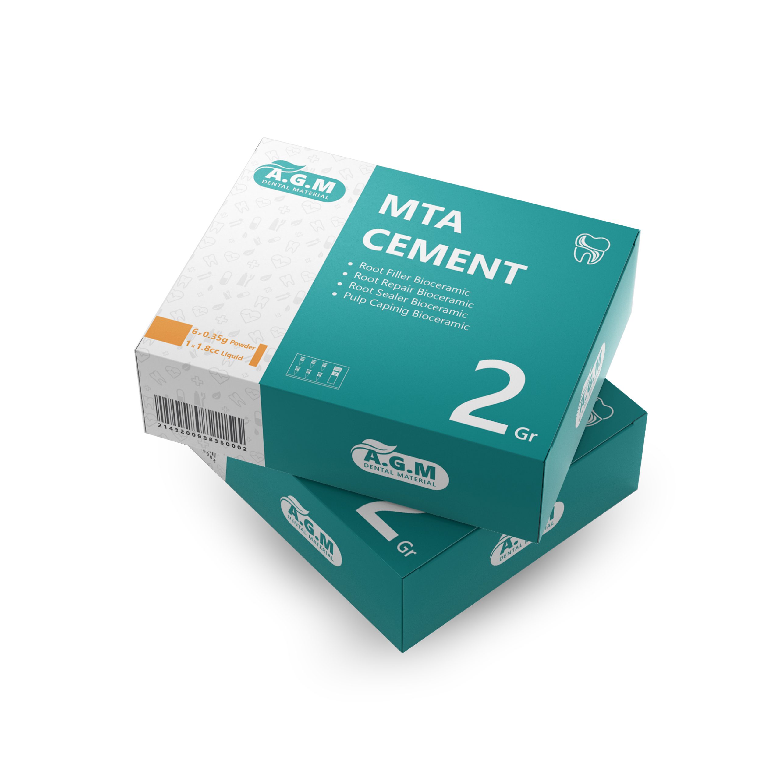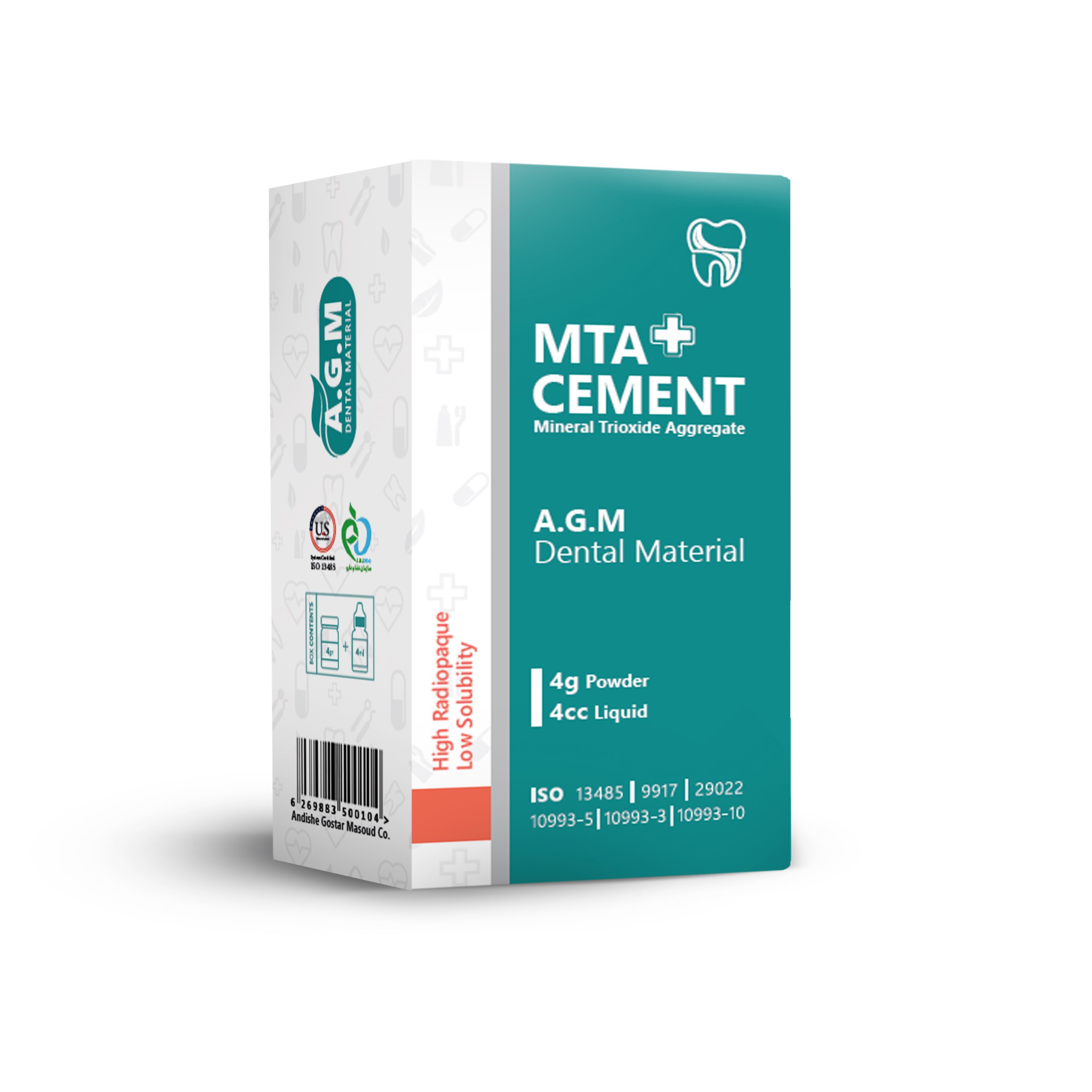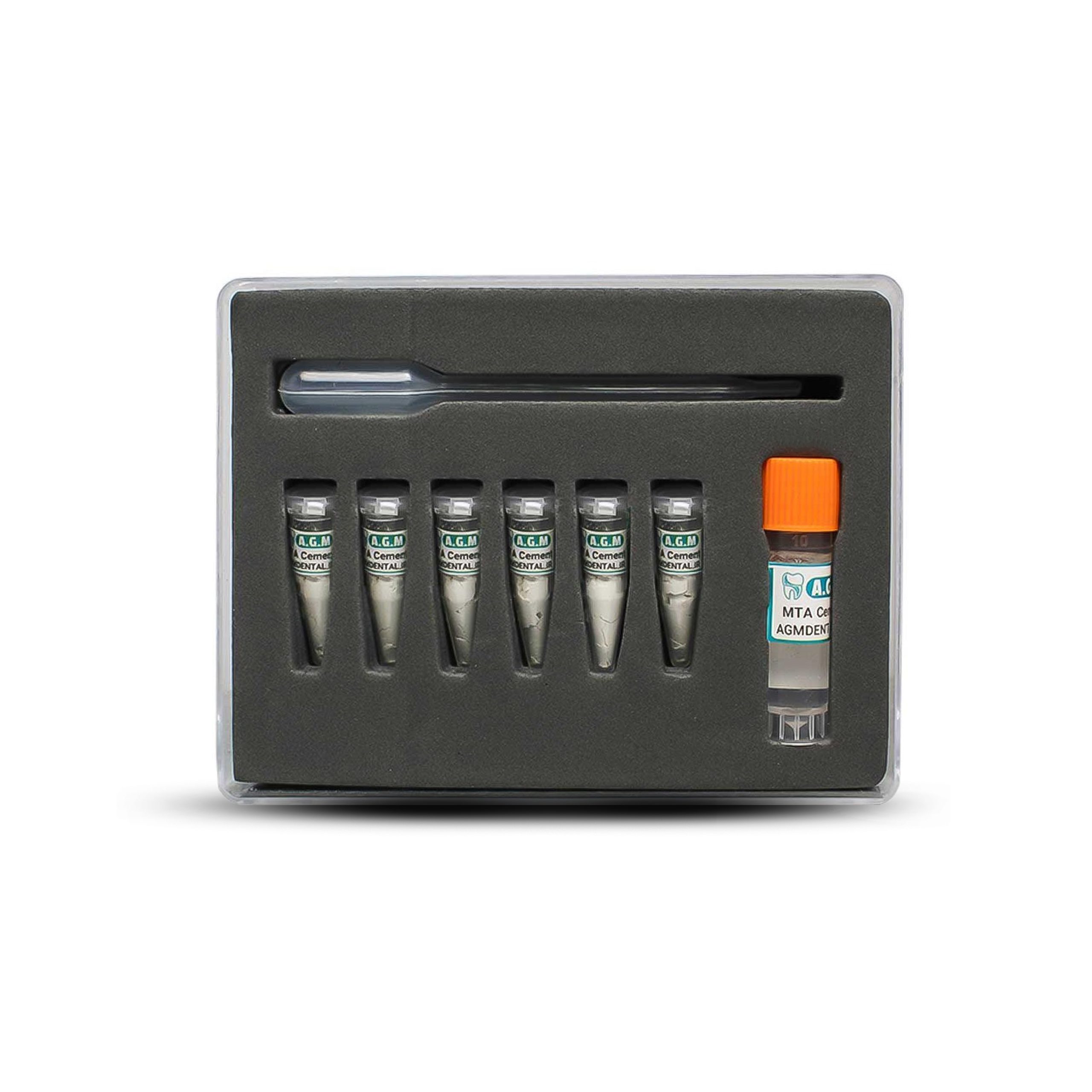 MTA یک بیوسرامیک ترمیم اندو با قدرت ترمیمی بالا میباشد که از دو جز پودر حاوی فازهای مختلف سیلیکات کلسیم، سیلیکات آلومینیوم و دی اکسید زیرکونیوم و جز مایع شامل آب استریل، کلسیم کلراید و ماده قوام دهنده طبیعی تشکیل شده است. یکی از مهمترین خواص ام تی ای برند AGM استفاده از زیرکونیا به جای بیسموت است که علاوه بر بهبود رادیواپسیته، از سیاه شدن تدریجی دندان جلوگیری میکند. علاوه بر این یونهای کلسیم آزاد شده از سمان باعث تشکیل پل عاجی در مواد استفاده به عنوان پوشاننده پالپ و بهبود ترمیم بیولوژیکی و القای بازسازی بافت سمنتوم و ریشه میشود. این سمان به منظور کاربرد در شرایط مرطوب طراحی شده است که با جذب آب به فرم ژل درآمده و سپس سخت میشود.